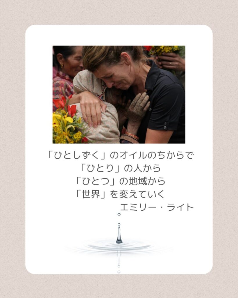 私たちがオイルを使うことが、遠い国の誰かの自立を助けることになるなんて。まさに『お買い物は投票』だね!